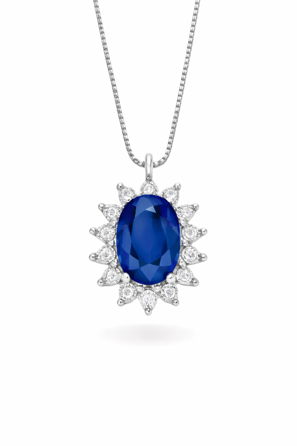 Collana DonnaOro Luce Iride realizzata in oro bianco 18kt con uno zaffiro naturale taglio ovale di caratura 0,70 ct impreziosito da un contorno in diamanti bianchi naturali con caratura totale di 0,05 ct. La collana si completa con una catenina in oro bianco con chiusura a moschettone pratica e sicura da indossare.